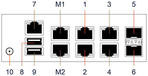 | M1, M2 | Management ports 1 and 2 (RJ45 Ethernet) |