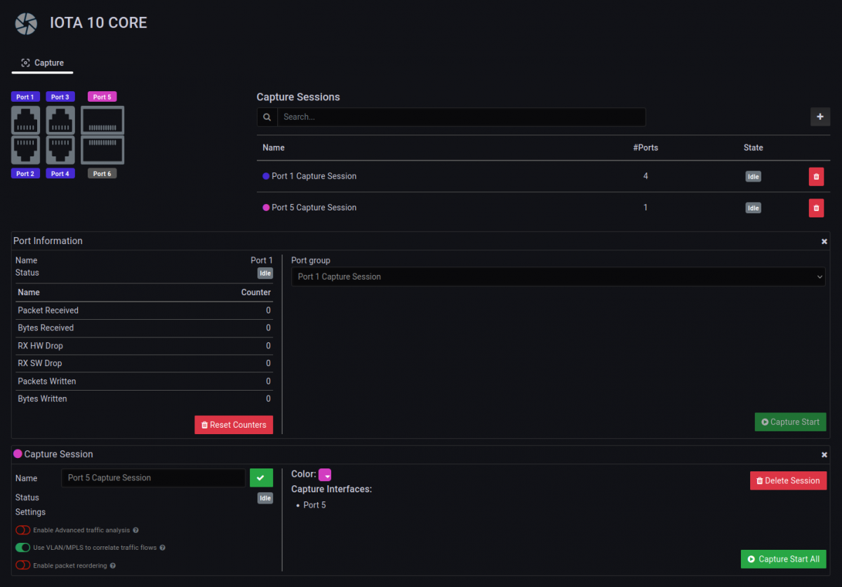 A typical example use case for capture sessions is when IOTA 10 CORE is connected directly to a TAP receiving two traffic links. These can be joined in a single capture session to make sure that bidirectional traffic is processed correctly.