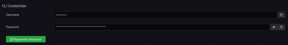The recovery CLI credentials can be found in the CLI Credentials section of the IOTA Settings > Administration page of the GUI. The username is static and cannot be changed. The password cannot be edited directly, but it can be regenerated using the Regenerate Password button. Either field can be copied to the clipboard by using the buttons to the right of each field.