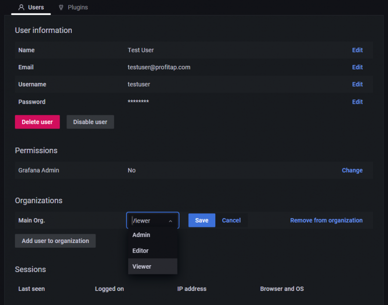 To view a user account, click the account in the list. In this view, it is possible to edit, delete, or disable/enable the selected user account. Click Change role to change the account's privileges. Depending on the selected role, the user has the following rights: