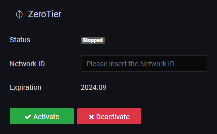 Log in to the IOTA device you wish to add to the virtual network, and navigate to the IOTA Settings > Network Configuration page. In the ZeroTier section, paste the Network ID in the Network ID field and click the Activate button.