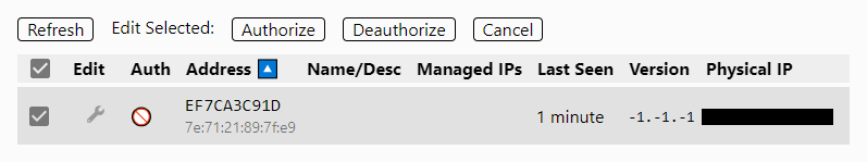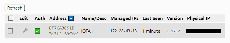 Tick the checkbox to the left and click Authorize to authorize the IOTA on the network, or click the Edit button to open the properties window, where you can authorize the device, set a name and description, and set a specific virtual IP address for the device. This virtual IP address will be used to access the IOTA remotely.