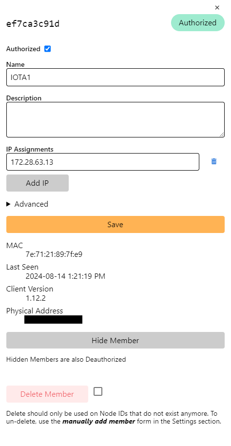 Open your ZeroTier account and click the virtual network to open its configuration page. The IOTA device should appear in the Members section after a few seconds.