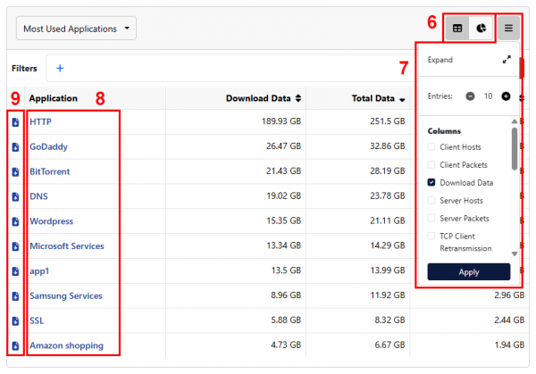 [2] The sorting order of the entries in the table can be changed by clicking the column titles, which will also update the doughnut chart to display the top entries displayed in the table.