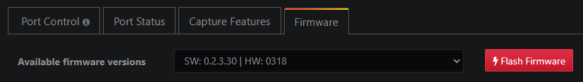 The Capture > Interface Configuration > Firmware page contains information about the capture interface's firmware, and provides the ability to update it. The latest capture interface firmware version is always included when updating the IOTA firmware. The update is not performed automatically.