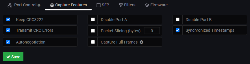 Enables capturing packet preamble and SFD. Enabling this option will disable filtering when exporting PCAP traffic. When using the dashboard to export traffic packets, the applied filters will be ignored.