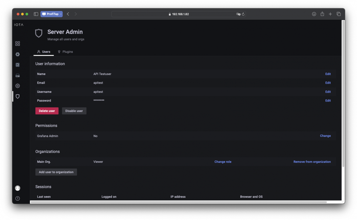 To ensure that sensitive information is not propagated and that no information on the device can be manipulated by the user, it is recommended to create a new special user. In this case, a user has been created with the username “apitest”. Note that this user has been automatically added to the organization as a “Viewer”. Nothing else needs to be configured, and this role will prevent any miscommunication by only allowing read-only access.