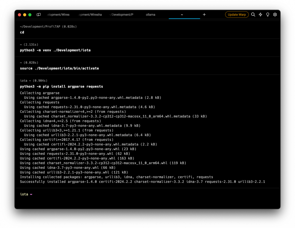 python3 -m venv ./Development/iota source ./Development/iota/bin/activate python3 -m pip install argparse requests