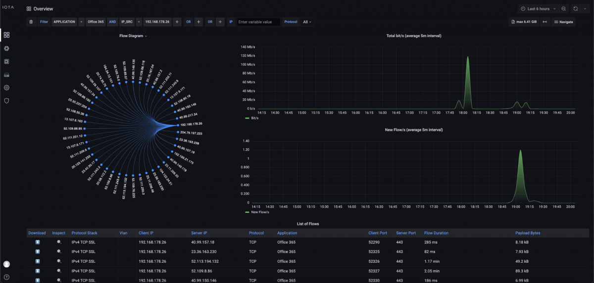 First, we set a filter on the Overview dashboard for the Office 365 application and the source IP address of the affected client. This allows us to quickly narrow down the affected communication relationship.