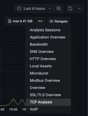 Since Office 365 establishes TCP communication on port 443 (HTTPS) to the respective target server, we focus on this communication pattern. To do this, we switch to the TCP Analysis dashboard via the Navigate menu in the upper right corner of the screen.