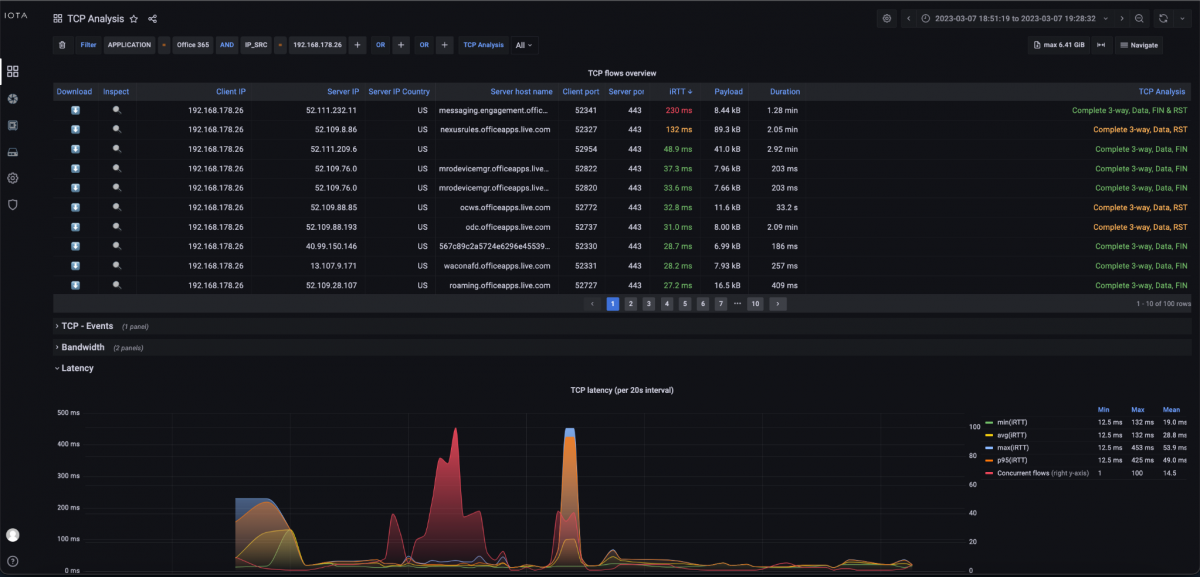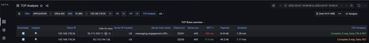 In the TCP Analysis dashboard, we immediately recognize the strong spike of the initial round trip time to the server '52.111.232.11' and the server hostname 'messaging.engagement.office.com' using the descending iRTT sorting.