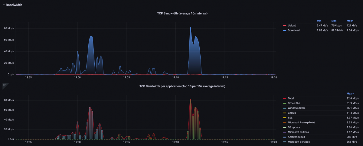 Figure 6: Bandwidth graphs of the “TCP Analysis” dashboard. The upper graph displays the total bandwidth and below the bandwidth per application.