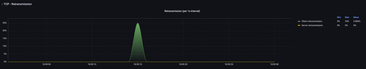 After setting the filter, we look at the TCP Retransmission graph at the bottom of the dashboard. Here, we can see that there were client-side retransmissions in the same time period. This means that the client either did not receive the requested data or acknowledgments (ACKs) or received them late and therefore started a retransmission. An analysis at other points of the communication path would have to provide precise information about where the error originated.