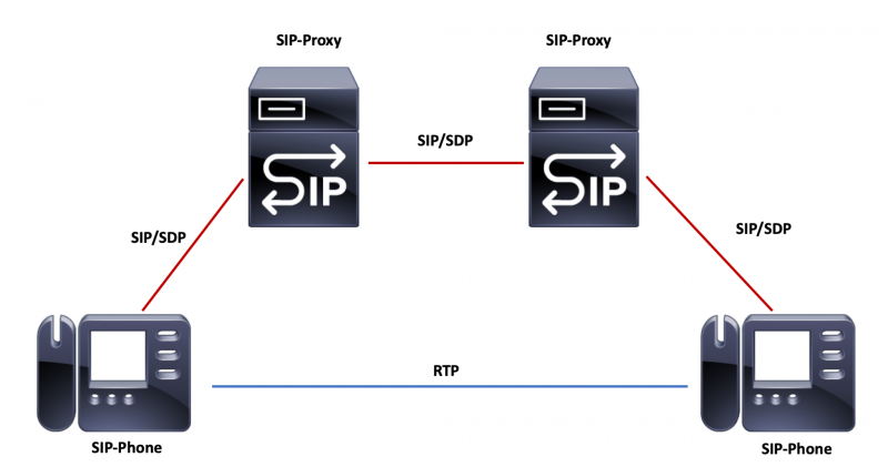 Figure 1: SIP trapezoid with differentiation between signaling over SIP and voice over RTP.