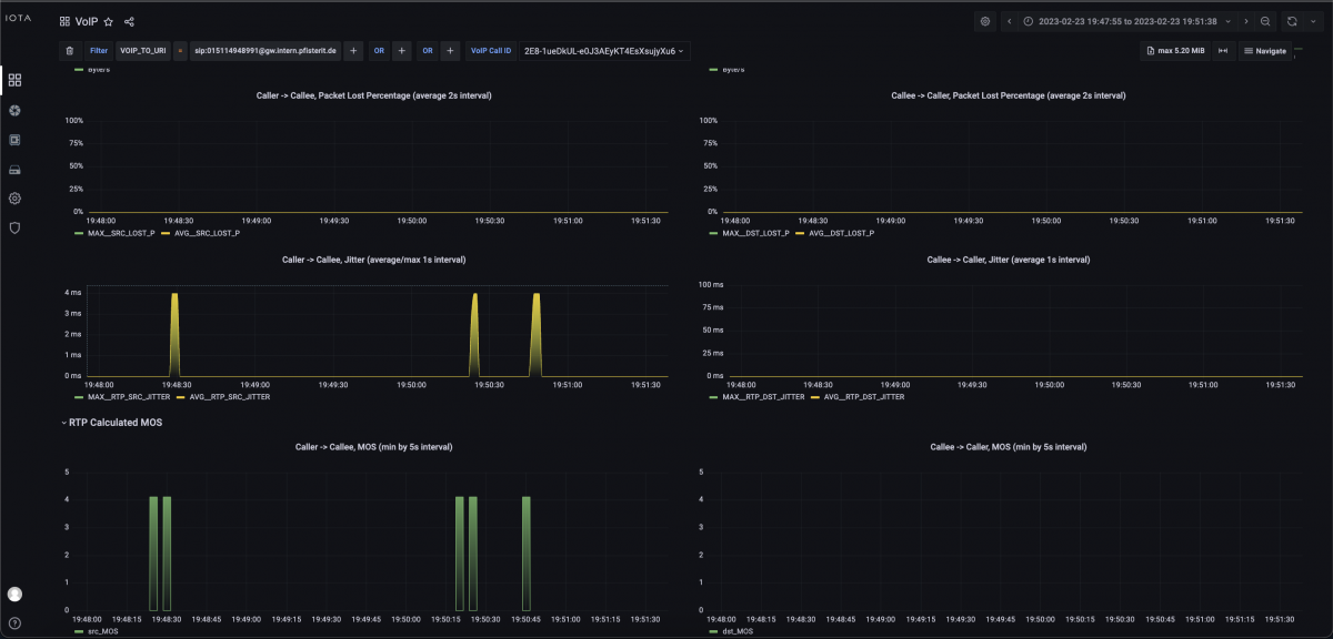 For quality problems in the transmission of voice data in the RTP data stream, IOTA offers a variety of options. For example, there is a prepared call detail dashboard that shows the jitter and packet losses separately for the calling party and the called party. The display of packet loss shows the values both as a percentage of the total number of packets and in the pure amount of packets that were lost. In addition to the clear graphics, filters with “>=” are also available. This way, calls with packet losses and jitter above certain thresholds, such as jitter >= 20ms, can be filtered out.
