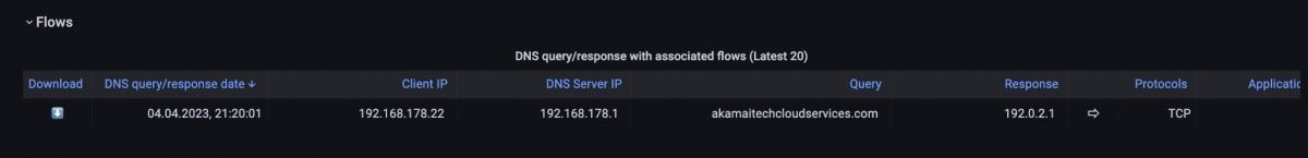 After the search, we can see that the malicious server was requested by DNS at about 9:20 PM. To further investigate which client attempts to connect to this server, we can go down to the DNS Overview dashboard and see the Client IP address which is requesting akamaitechcloudservices.com. In our example in Figure 10, it was 192.168.178.22. Now we know which client tried to connect to this server.