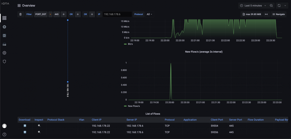 IOTA offers a wide range of options for filtering the relevant communication patterns and time windows for security analyses. In addition, it provides intuitive dashboards compared to other tools to enable simplified and accelerated analysis, even for people without in-depth protocol knowledge.