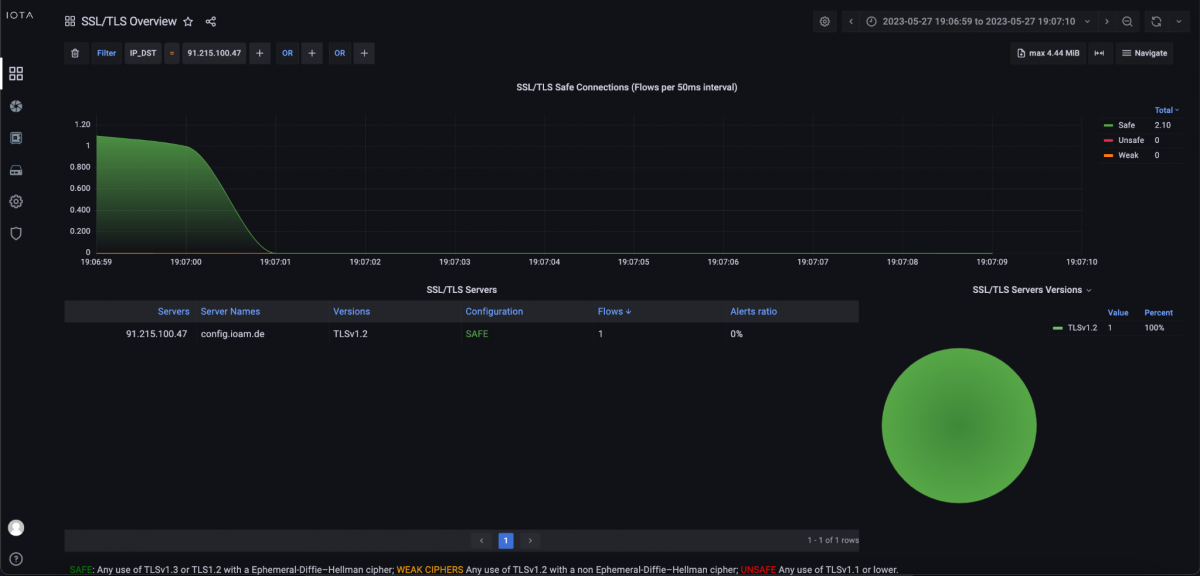 In the SSL/TLS Overview dashboard, in the SSL/TLS servers listing, we recognize the associated server name with “config.ioam.de”, with which the client had established a connection.