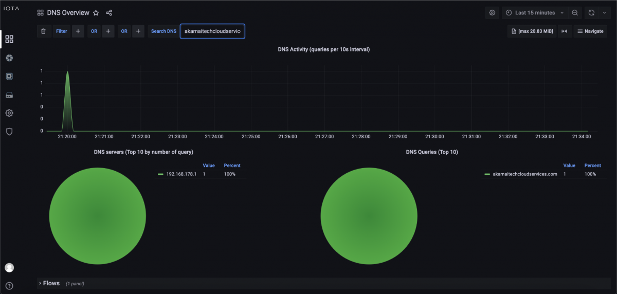 If we need to check which hosts attempted to connect to a specific server that seems to provide malicious software, we can also do that with IOTA. If there are known FQDNs that are related to these servers, we could use the DNS Overview dashboard.
