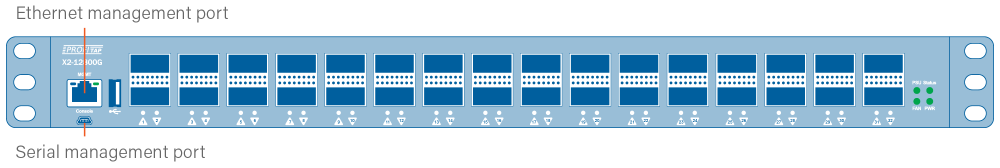 X2-Series devices feature a serial management port and an Ethernet management port. The serial management port can be used to configure the Ethernet management port's network settings. The Ethernet management port is used to access the unit's Web GUI and SSH CLI.