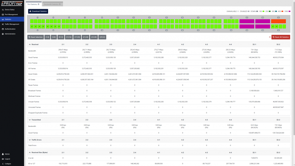 The Ports Statistics tab displays traffic statistics for the selected interface(s). Clicking one or more interfaces will result in visually check-marking them and in adding new column(s) with their respective data stats. The Reset Statistics button will perform a reset of the hardware counters used in all the ports. Statistics for the select ports can be downloaded via the Download Statistics button.