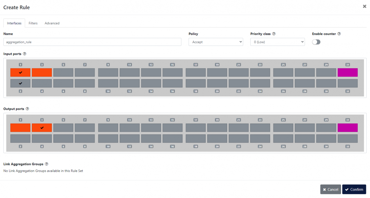 Aggregation means combining multiple incoming data streams into one stream, to be sent to one or more outputs. This feature is useful when the user needs to send traffic incoming from different sources to a single tool. Aggregation, replication, load balancing, and filtering can be combined. In this example, we will perform the aggregation of traffic arriving on ports 1 and 2, and send the combined stream to port 3.