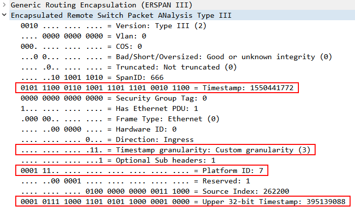 The ERSPAN type 3 packet leaving the X2-Series device has the Platform ID field set to a value of 7, and the Timestamp granularity field set to a value of 11, which means nanoseconds. The Timestamp and Upper 32-bit Timestamp fields together carry the timestamp information of the packet.
