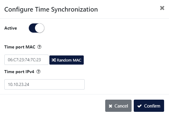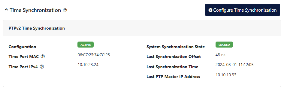 Click the Configure Time Synchronization button to configure the MAC and IP address associated with the port. Information about the internal synchronization process and its performance is then available from the Rule Set page's PTPv2 Time Synchronization table.