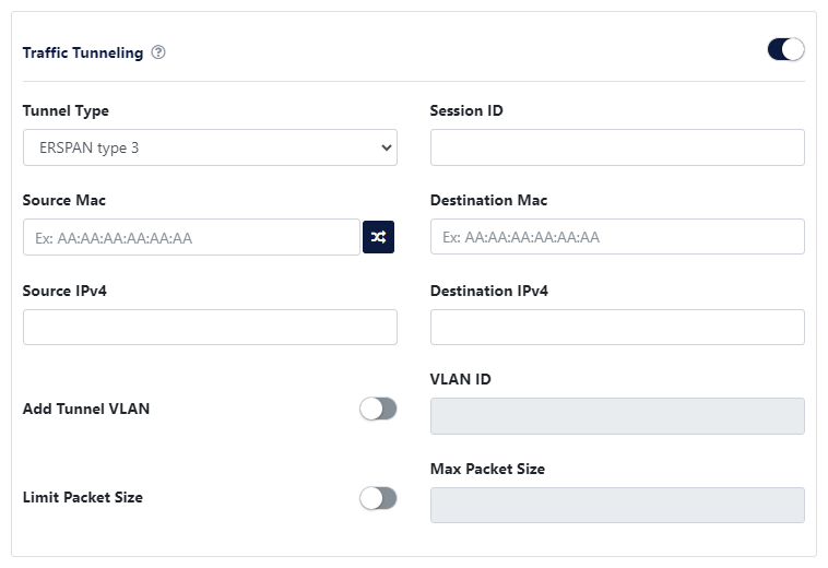 To encapsulate traffic in an ERSPAN type 3 tunnel, navigate to a rule's Advanced tab, enable Traffic Tunneling, and set Tunnel Type to ERSPAN type 3. Fill in the fields as required.