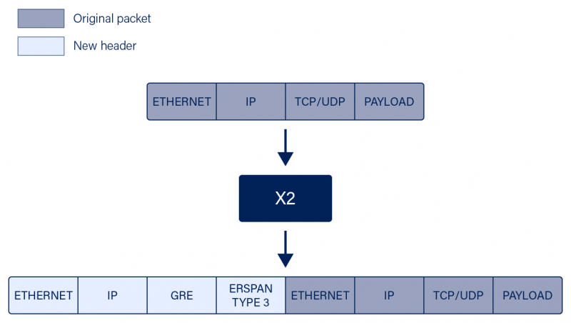 Below is an illustration of the encapsulation of an L2 frame in an ERSPAN type 3 GRE tunnel by an X2-Series packet broker. New headers are added to the frame. The ERSPAN type 3 header contains the timestamping information.