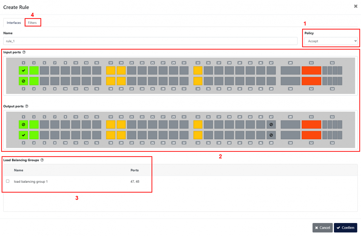 If load balancing groups have been created, they appear in the Load Balancing Groups section [3]. Selecting one or more groups here will set them as output, in which case output interfaces won't need to be selected in the section above. Selecting multiple load balancing groups will replicate the traffic to each of these groups.