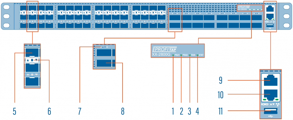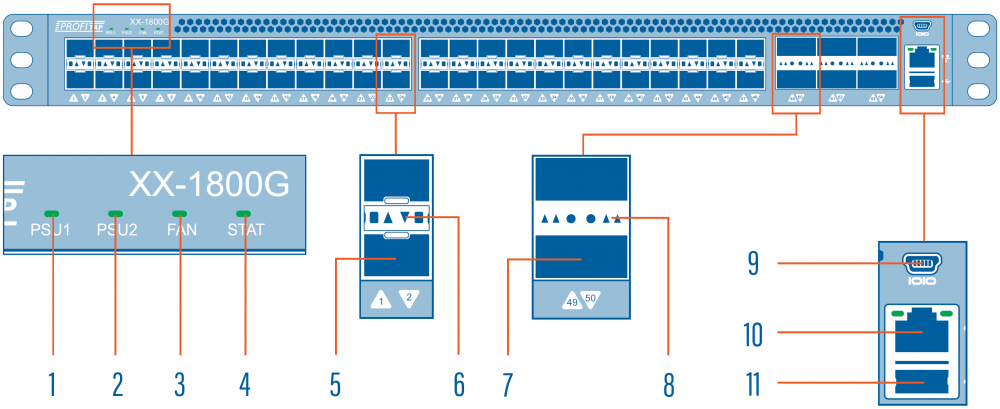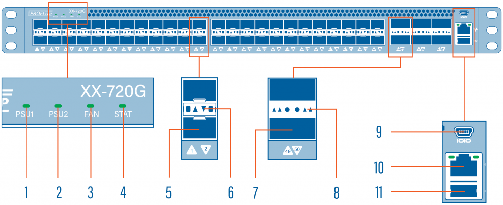 | 5 | 1/10G SFP+ ports (1–48) | 11 | USB port |