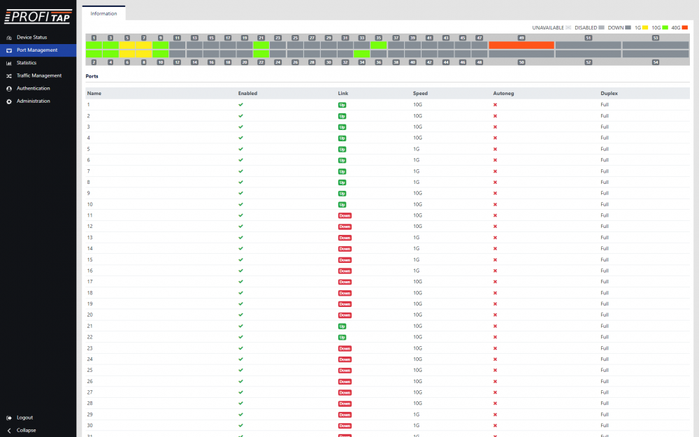 The Port Management page is a graphical representation of the system, providing detailed status information and allowing an easy configuration of each interface (port), as well as a more detailed view of the attached SFP modules. Besides the visual overview, the port information is also provided in a list view.