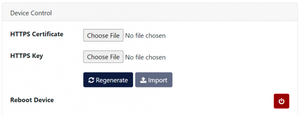 The Device Control section of the Administration > Setup page provides the ability to import or renew the SSL certificate for the web interface. The Regenerate button creates a new SSL certificate. To import a pre-generated SSL certificate and key, click the Choose File button for both HTTPS Certificate and HTTPS Key and select the appropriate files to upload. Both key and certificate files are expected to be in PEM format, and should not be password-protected. Click the Import button. After both files have been uploaded, the system checks their validity, replaces the current versions, and restarts the web interface.
