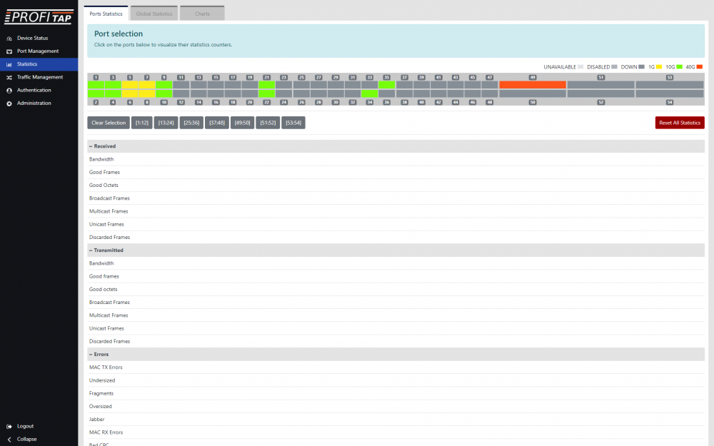 The Ports Statistics tab displays traffic statistics for the selected interface(s). Clicking one or more interfaces will result in visually check-marking them and in adding new column(s) with their respective data stats. The Reset All Statistics button will perform a reset of the hardware counters used in all the ports.