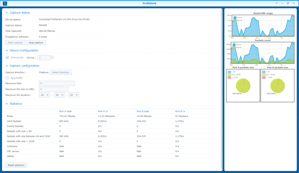 The long-term capture feature expands the number of use cases for ProfiShark. By combining the capture capabilities of ProfiShark with the storage capabilities of a NAS, it becomes possible to capture traffic for extended periods of time, making it easier to catch intermittent network problems in the act.