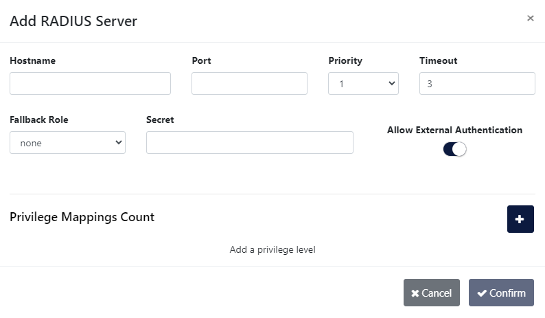 The RADIUS tab allows adding one or more RADIUS servers, and configuring the following details: