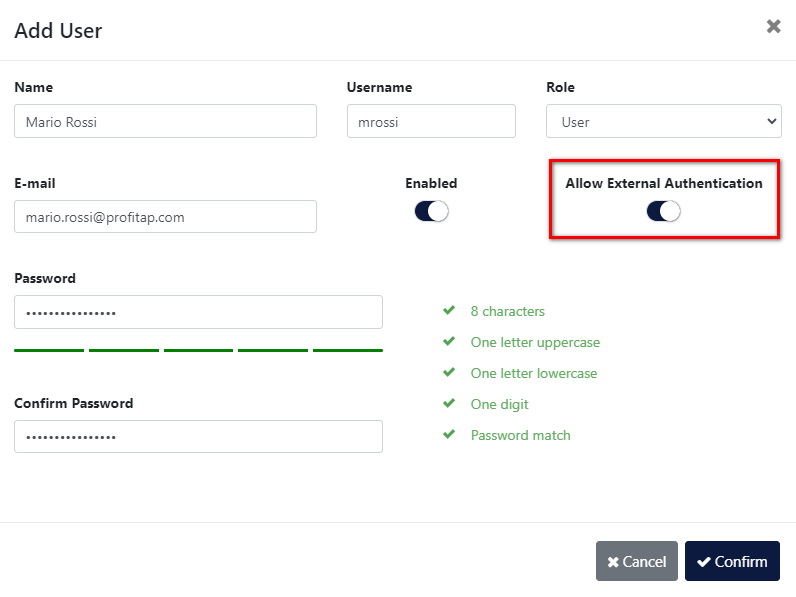 The Allow External Authentication option allows the user's credentials to be used to log into devices on which Shared Authentication was enabled (see Centralized Authentication section below).
