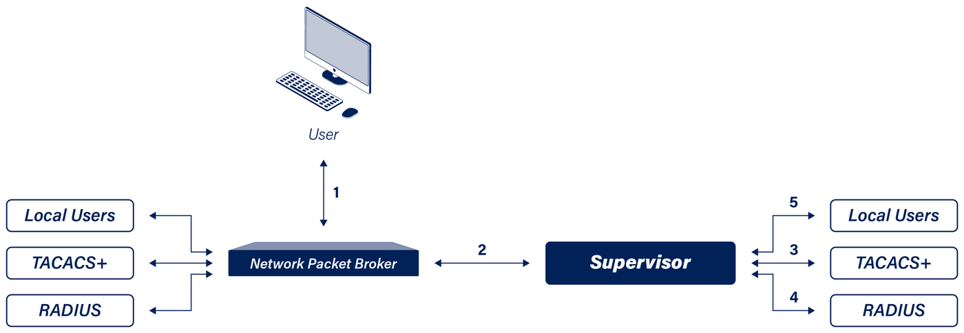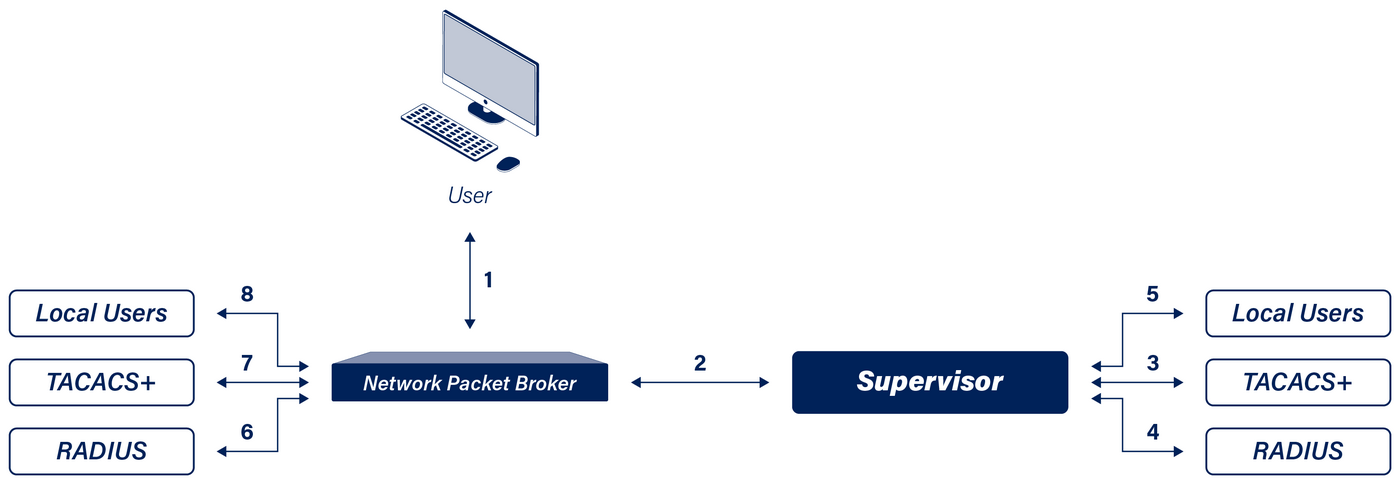 - Supervisor skips TACACS+ and forwards the request to the RADIUS server. In this scenario, the credentials are valid. The user can log in to the device.