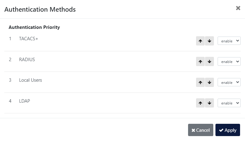 Supervisor allows users to not only define multiple authentication methods, but also to configure how the different methods are used by the system. Clicking the Configure Authentication button on either the Users, TACACS+, RADIUS, or LDAP page allows users to see the list of available authentication methods and change their priority and activation strategy.