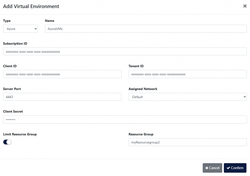 - Resource Group: Logical collection that groups related VM resources. If Limit Resource Group is enabled, specify the resource group here.