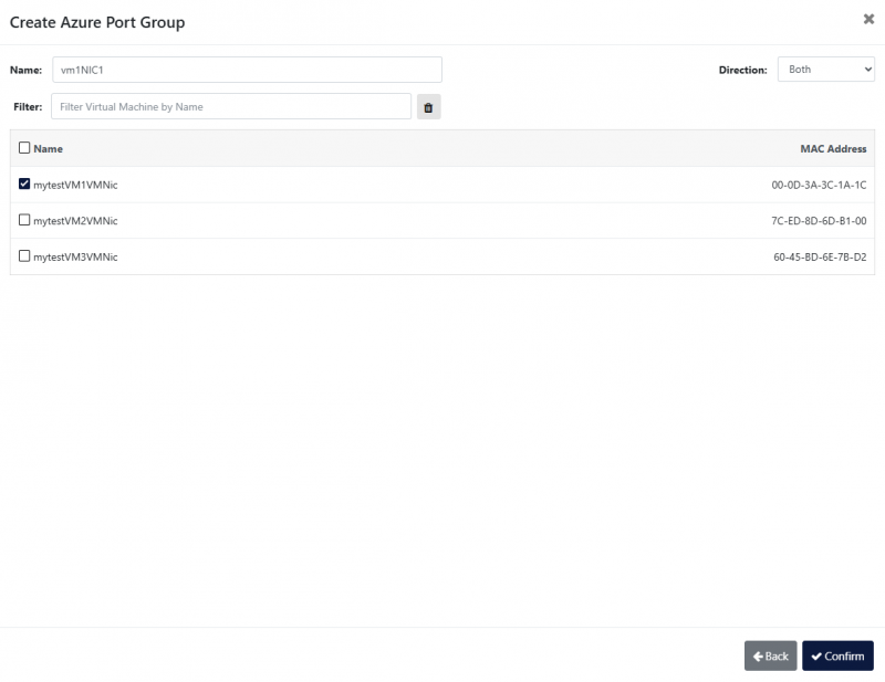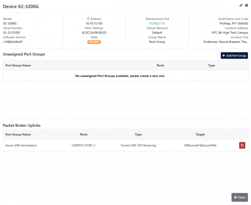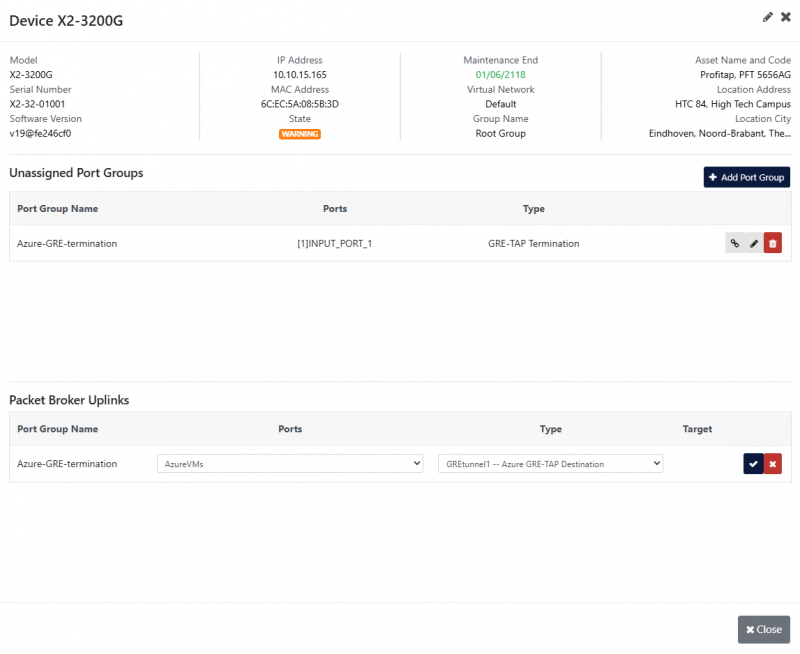To link an Azure VM environment to an X2-Series device, create a Tunnel Termination port group on that device with the same IPv4 address as the one specified above, then create an uplink between this port group and the tunnel destination configured above. You can then create Traffic Rules to send traffic from specific interface groups to any destination linked through the X2-Series device.