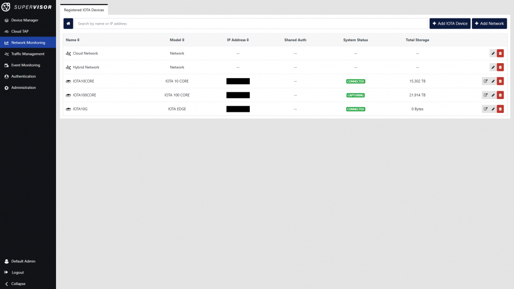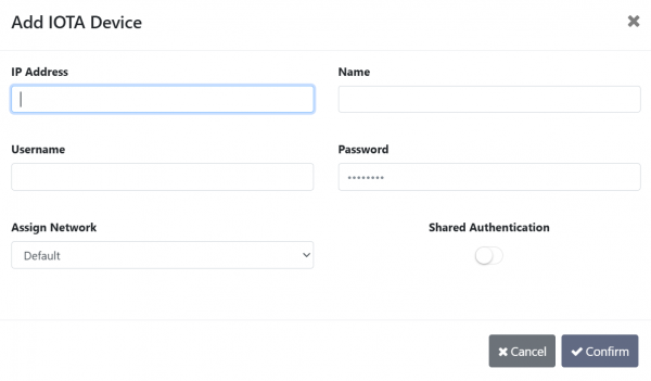 To add a new device, click the Add IOTA Device button in the top right corner of the interface, and enter the device's information in the Add IOTA Device window. Enable Shared Authentication if you wish to enable Supervisor's centralized authentication function on this device (see Centralized Authentication). The device's information can be changed at a later time by clicking the device's Edit