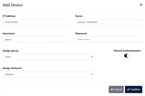 To add a new device, click the Add Device button in the top right corner of the interface, and enter the device's information in the Add Device window. Select a group or network in this window to add the device to this group or network. Enable Shared Authentication if you wish to enable Supervisor's centralized authentication function on this device (see Centralized Authentication). The device's information can be changed at a later time by clicking the device's Edit