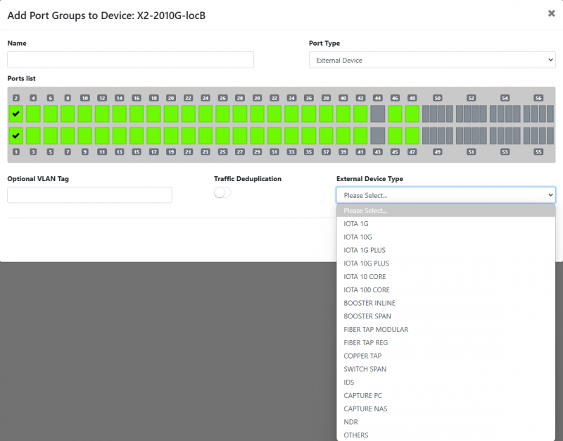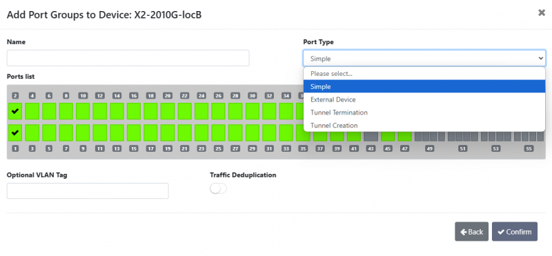 XX-Series devices can only create Simple and External Device port groups, without deduplication. X2-Series devices can create all port group types, and use packet deduplication if available on the device.
