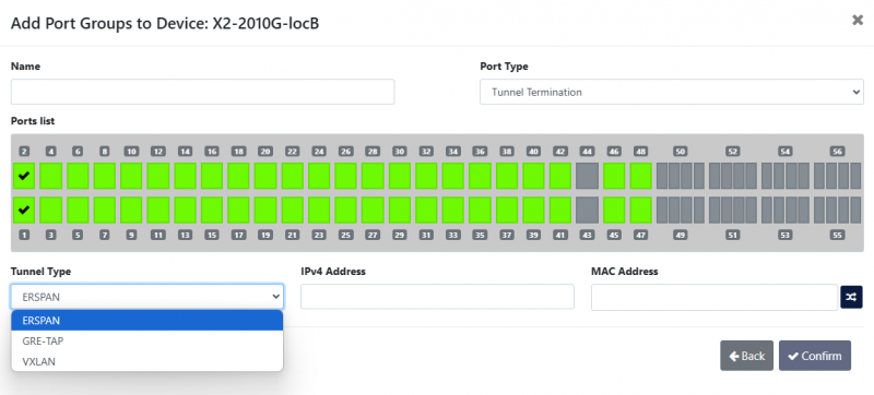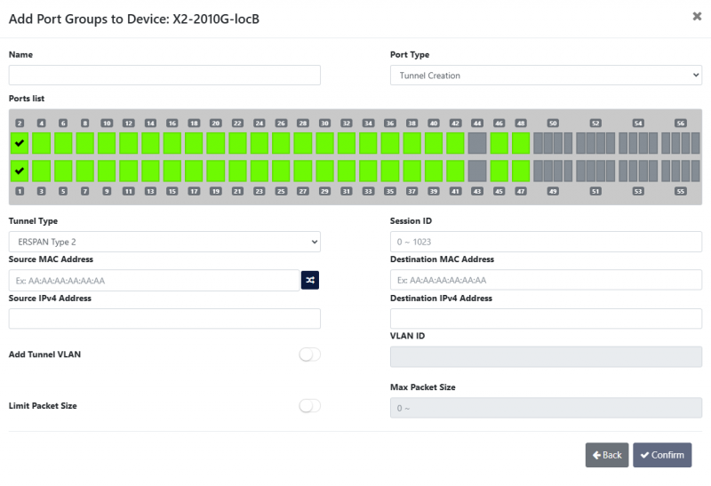 X2-Series devices can encapsulate traffic in ERSPAN type 2, ERSPAN type 3, and GRE-TAP tunnels. This is done by creating a port group of the Tunnel Creation type.