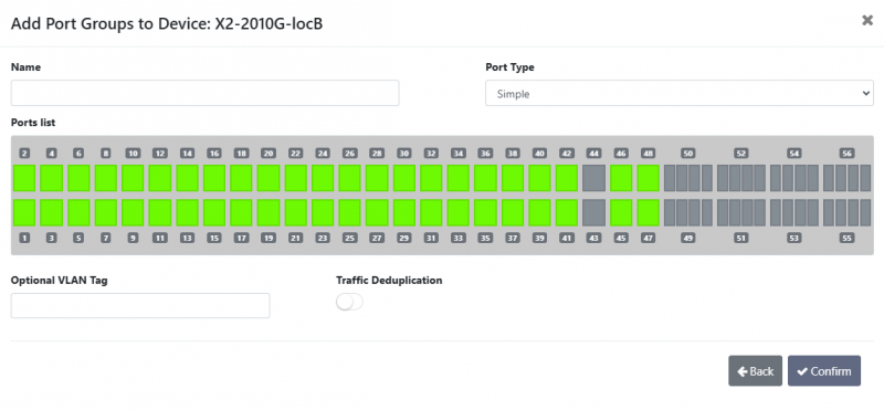 To create a port group, navigate to the Device Manager > Registered Devices page or Traffic Management page, click the device for which to create a port group to open its device details window, and click the Add Port Group button to open the Add Port Groups window. In this window, give a name to the port group, select the port type, select one or more ports, configure the additional options if necessary, and click the Confirm button.