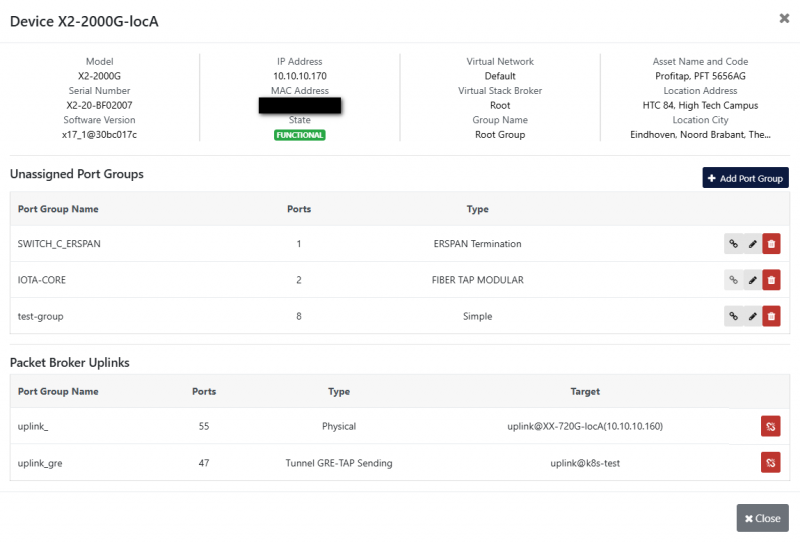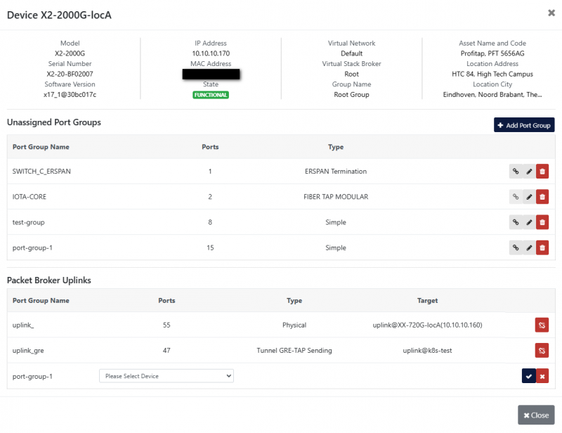 Clicking on a device provides additional information about this device, and the ability to create port groups and packet broker uplinks prior to Traffic Management.