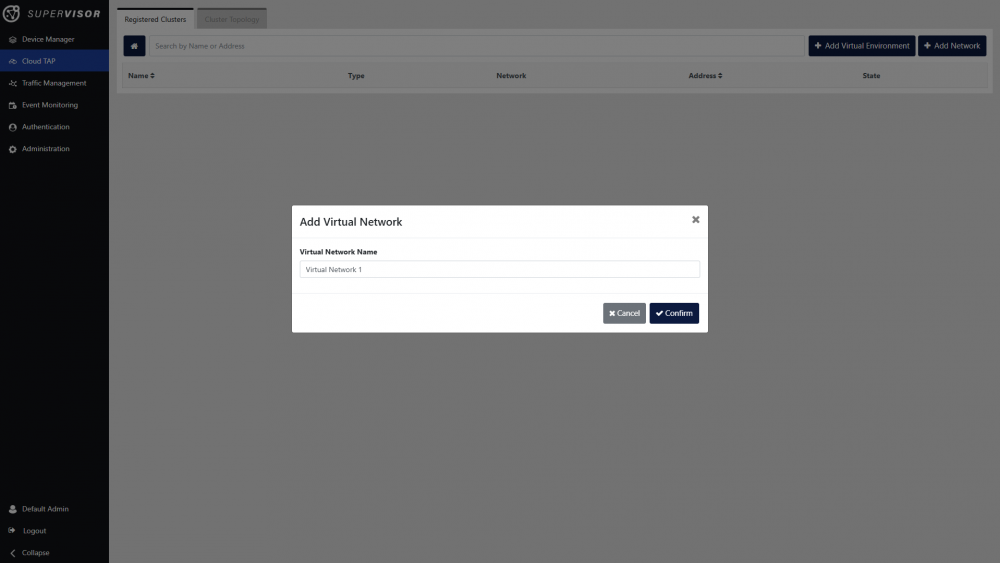 If you wish to register the cluster on a separate virtual network from the existing ones, click the Add Network button to create a new network. Enter a name for the new virtual network, and click the Confirm button.