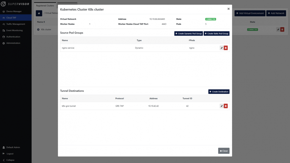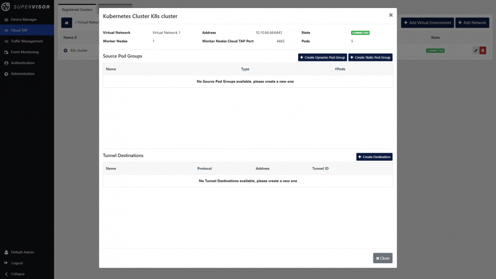 Scenario: First, we will register the Kubernetes cluster on Supervisor. Then, we will define a group of application pods to target, and create a tunnel destination. Finally, we will link the pod group and the tunnel destination by creating and deploying a traffic rule.